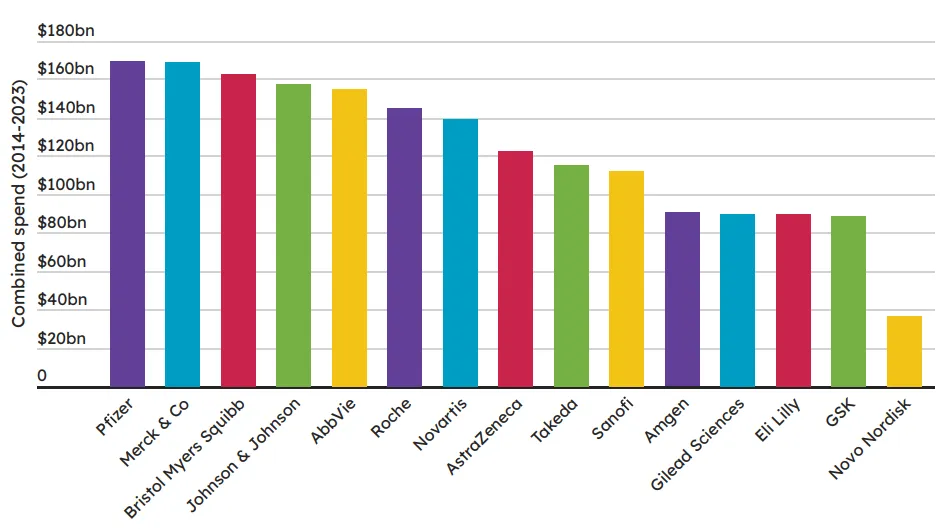 近日,Evaluate发表了一篇文章,对TOP15制药巨头在2014年~2023年期间对药物研发、许可交易以及并购方面的资金投入进行了分类汇总,并且探讨了这些支出所带来的回报率情况。