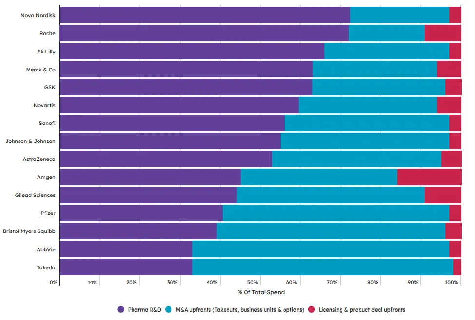 产品/技术引进的支出在所有公司的占比都不算多。唯一一家将总支出的10%以上用于此类交易的公司只有安进,这主要是因为2019年以134亿美元引进了Celgene的银屑病药物Otezla(apremilast)的全球权利。