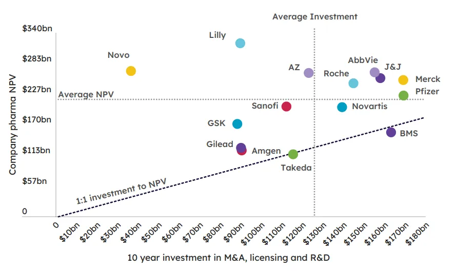创新药的开发归根结底是一门生意,投资者也会更关注企业的持续盈利性。尽管制药行业近年来投入研发的资金越来越多,但好的生意并不常会发生,投入的成本也不代表能转换出同等的价值回报。那么,付出的投入究竟创造了怎样的价值,从TOP15制药巨头资产的净现值(NPV)这一维度或许可以进一步了解到研发支出回报率,并且思考这些投资到底是否值得。