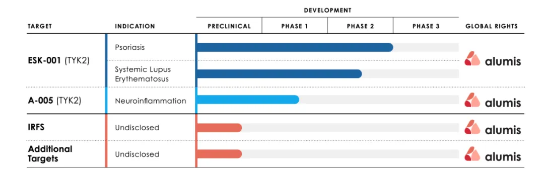 Alumis公司最先进的候选产品ESK-001来自于中国老牌传统药企海思科,这是一种口服、高选择性、小分子、TYK2异构抑制剂,目前正被评估用于治疗中重度斑块状银屑病和系统性红斑狼疮患者。2021年,海思科的控股子公司FT集团与Foresight Capital的非上市公司FL2021-001(即Alumis的前身)达成一场关于TYK2产品的专利和权益的转让,涉及高达6000万美元的首付加上1.2亿美元的里程碑付款。