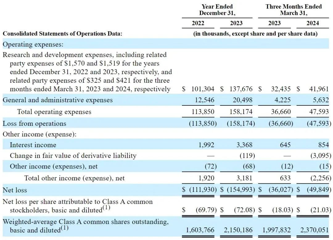招股书显示,Alumis暂无营收,其2022年、2023年研发开支分别为1.01亿美元、1.38亿美元;运营亏损分别为1.14亿美元、1.58亿美元;净亏损分别为1.12亿美元、1.55亿美元。