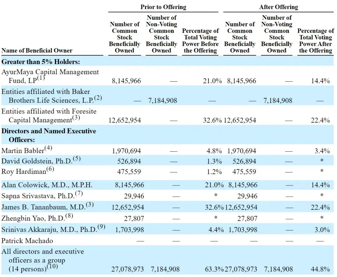 IPO后,AyurMaya Capital Management Fund持股14.4%,Foresite Capital Management 持股为22.4%,Martin Babler持股为3.4%。