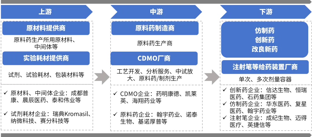 国内多肽药物产业链目前已发展较为完善,可以分为上游的原材料和试剂耗材、中游的多肽原料药及CDMO公司,以及下游的多肽药物研发、给药装置企业,大致情况如下图所示。