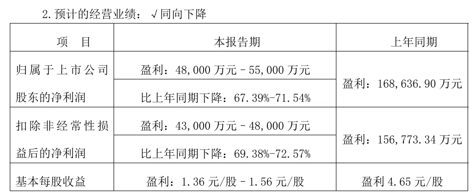 2024年上半年,公司实现营收26.6~27.4亿元,同比下降40.72~42.45%;对应净利润4.8~5.5亿元,同比下降67.39~71.54%。