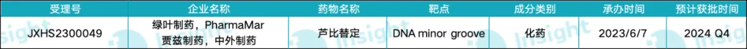 2023 年 6 月,绿叶制药宣布其注射用芦比替定针对小细胞肺癌(SCLC)的适应症在国内申报上市(受理号:JXHS2300049)。