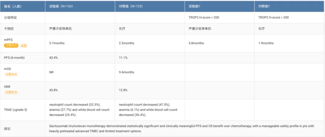 OptiTROP-Breast01 研究显示,芦康沙妥珠单抗组相较于化疗组在 mPFS(5.7 个月vs 2.3 个月)、6 个月 PFS 率(43.4% vs 11.1%)以及 ORR(43.8% vs 12.8%)等各项指标上均表现出显著优势。尤其是在 TROP2 H 评分>200 的亚组患者中,芦康沙妥珠单抗组的 mPFS 为 5.8 个月,化疗组为 1.9 个月。安全性方面,该药物与 Ⅰ 期、Ⅱ 期研究表现一致,无新的安全事件发生。