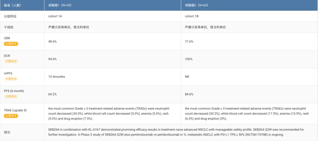 在 OptiTROP-Lung01 研究中,患者接受芦康沙妥珠单抗与 KL-A167 两种不同剂量组合治疗。队列 1A 的 ORR 为 48.6%,DCR 为 94.6%,mPFS 为 15.4 个月(6.7,NE),6 个月 PFS 率为 69.2%。队列 1B 的 ORR 达 77.6%,DCR 为 100%,mPFS 未达到(8.4,NE),6 个月 PFS 率为 84.6%。安全性方面,未观察到新的安全性信号。