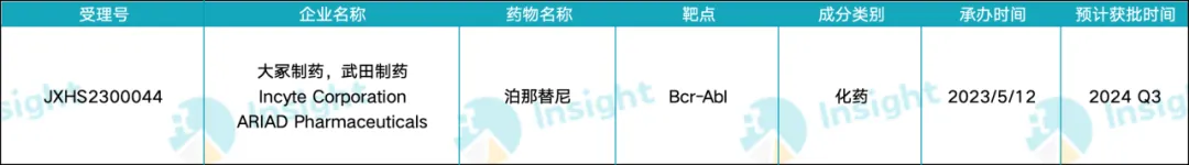 2023 年 5 月,大冢制药第三代 Bcr-Abl 激酶抑制剂泊那替尼在国内申报上市(受理号:JXHS2300044),有望于今年下半年获批。