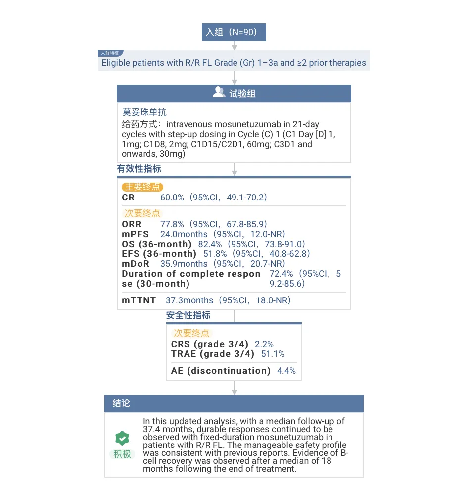 在关键 II 期研究的 3 年随访中,莫妥珠单抗显示出较高 CR 率和长久的临床疗效。中位随访 37.4 个月后,患者的 CR 率达到 60%,其安全性概况可控,并与先前报告一致。在治疗结束后中位 18 个月,有证据显示 B 细胞得到恢复。目前,欧盟委员会和 FDA 已批准该药物上市,用于治既往接受过至少两种系统性治疗的复发或难治性滤泡性淋巴瘤。
