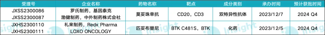在这一领域,罗氏第二款 CD20/CD3 双特异性抗体莫妥珠单抗和礼来可逆性 BTK 抑制剂匹妥布替尼分别针对不同的 NHL 亚型。前者主要用于治疗滤泡性淋巴瘤,后者则用于治疗套细胞淋巴瘤。这两款药物均在 2023 年 12 月申请上市,预计在今年下半年获批。