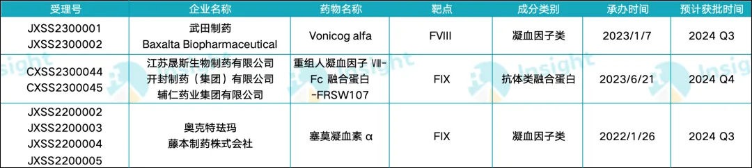 在血管性血友病领域,武田制药研发出重组血管性血友病因子(rVWF)注射用药物 Vonicog alfa。同时,晟斯生物和奥克特珐玛针对 A 型血友病分别研制了重组人凝血因子 Ⅷ-Fc 融合蛋白-FRSW107 和塞莫凝血素 α。这三种新型治疗药物均有望在今年下半年获批上市。