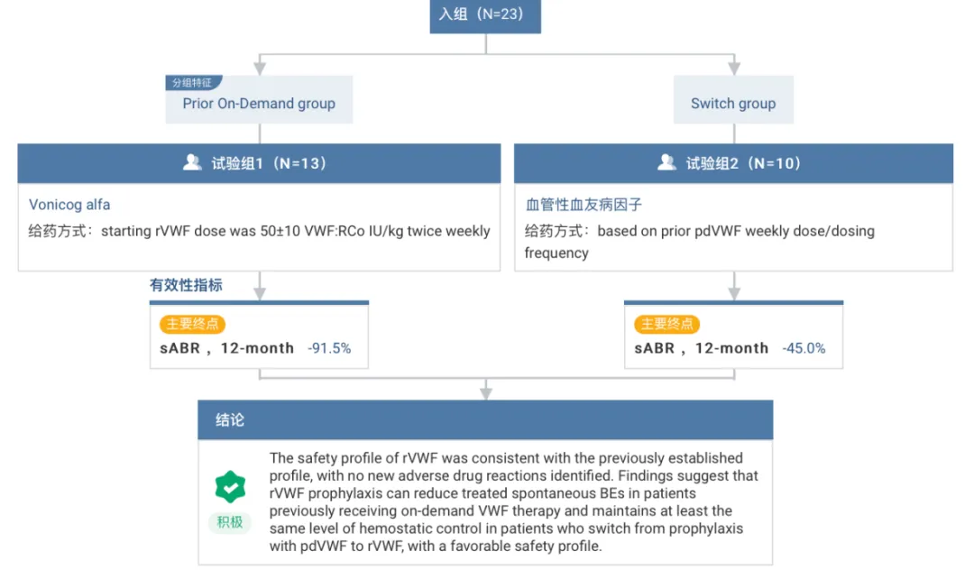 在另一项三期研究中,研究人员评估了重度血管性血友病成人在接受 Vonicog alfa 预防治疗时,其治疗性自发性出血事件的年化出血率(sABR)与历史数据的对比。研究纳入了 23 名患者,分为需求时给药组和血浆衍生 VWF(pdVWF)预防治疗切换组。12 个月的结果显示,需求时给药组 sABR 下降 91.5%,切换组下降 45.0%。