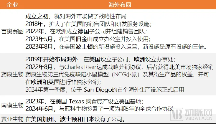 其中,百奥赛图布局海外市场的时间最早。2009年,百奥赛图成立。成立之初,百奥赛图就对海外市场做了战略性布局。2018 年开始,百奥赛图逐步对北美,欧洲及亚太销售网络进行升级,建立了完善的全球化销售网络体系。