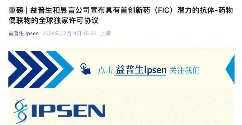 7 月 11 日,益普生和昱言公司宣布就 ADC 新药 FS001 达成独家全球许可协议。