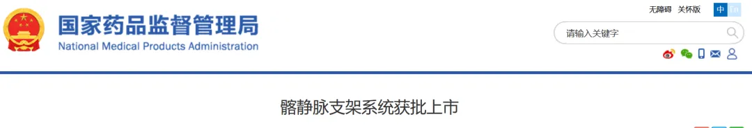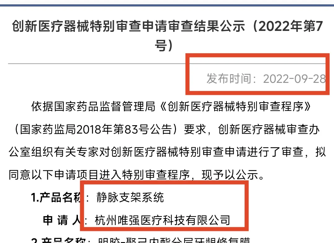 2024年7月11日,国家药品监督管理局(NMPA)批准了杭州唯强医疗科技有限公司生产的“髂静脉支架系统”创新产品注册,原文如下: