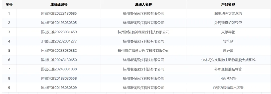 *经查询,截止2024年7月11日,唯强医疗有注册证9张。上图中2张是变更过的,产品受托生产企业名称为杭州唯强医疗科技有限公司。