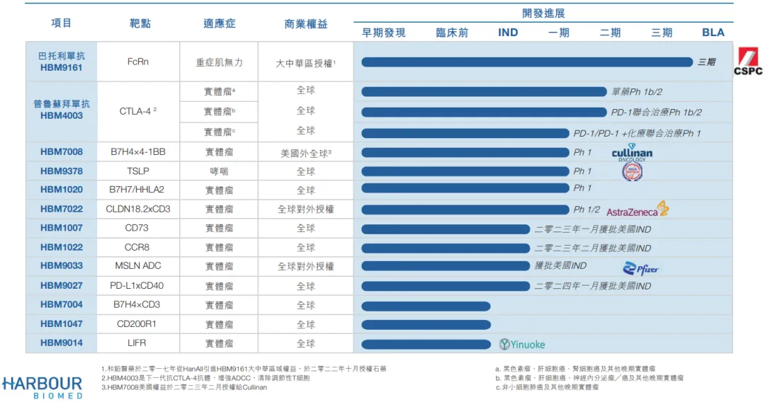 HBM9033是一款ADC药物,靶向于特异性靶向人间皮素(MSLN),由和铂医药和宜联生物联合开发。2023年8月,HBM9033的新药研究申请许可获得美国FDA批准;同年12月,和铂医药全资子公司诺纳生物与辉瑞就HBM9033的全球临床开发和商业化达成协议,总交易金额超过10亿美元。