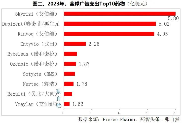 就单一企业而言,2023年药品广告支出最高的是艾伯维,旗下三款药物Skyrizi(第1位)、Rinvoq(第3位)、Vraylar(第10位)的广告费均跻身Top10,合计12.37亿美元。(详见图二)