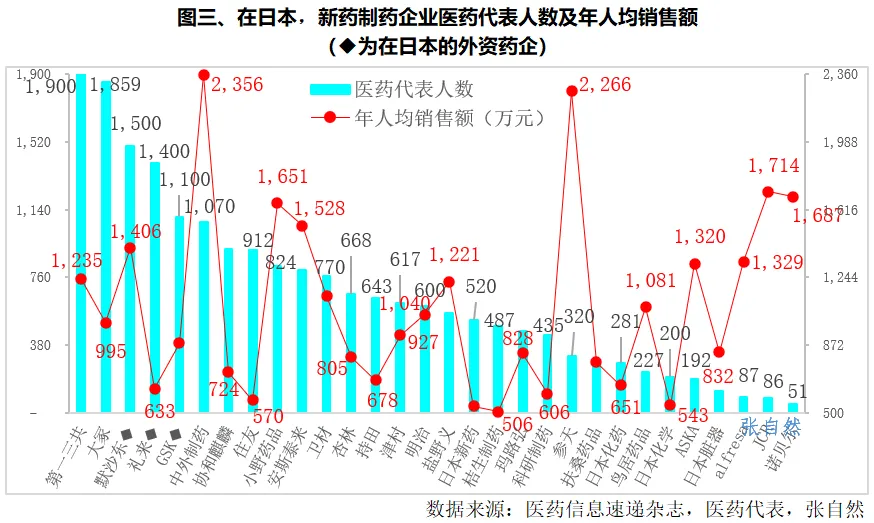 日本医药代表人数少,但医药市场规模大,所以,日本医药代表人均销售额较高。