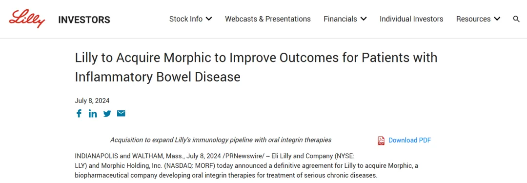7月8日,礼来宣布已与Morphic Therapeutic达成协议,将以每股57澳元/股的价格现金收购后者的所有流通股,总交易金额约为32亿美元。该交易预计将于2024年Q3完成。
