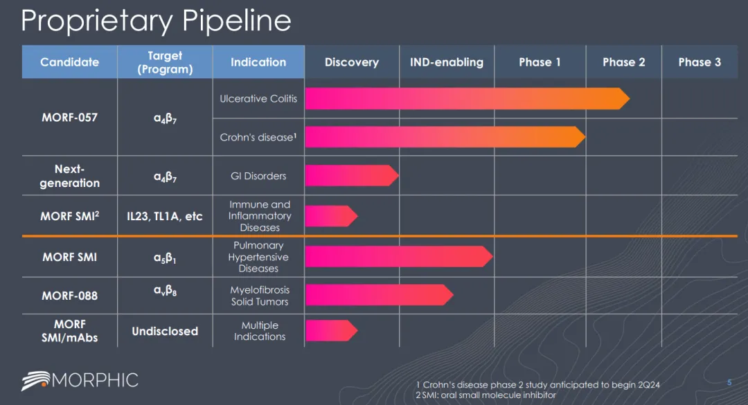 目前,Morphic管线中仅有一款临床在研产品——用于治疗炎症性肠病(IBD)的口服小分子α4β7抑制剂MORF-057。Morphic正在开展MORF-057治疗溃疡性结肠炎(UC)的一项II期研究和治疗克罗恩病(CD)的一项II期研究。