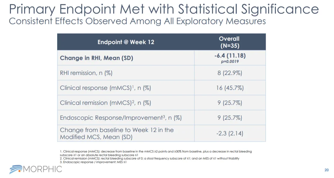 2023年4月,Morpic公布了MORF-057(100mg,每日2次)治疗中重度UC的II期EMERALD-1研究(n=35)结果。结果显示,患者接受治疗12周后,Robarts组织病理学指数(RHI)评分显著下降(-6.4分,P=0.002);25.7%患者达到临床缓解(通过改良版Mayo评分(mMCS)评估),45.7%患者达到临床应答。