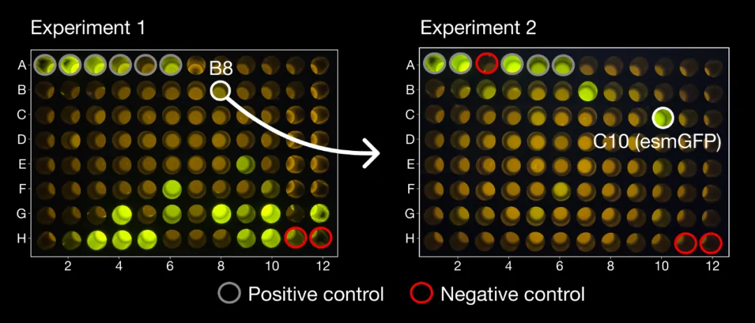 ESM3先产生了B8,一种与自然界已知的所有GFP都不同的“暗淡版”GFP。从B8开始,ESM3生成了esmGFP,亮度与其他天然GFP相似(来源:EvolutionaryScale)