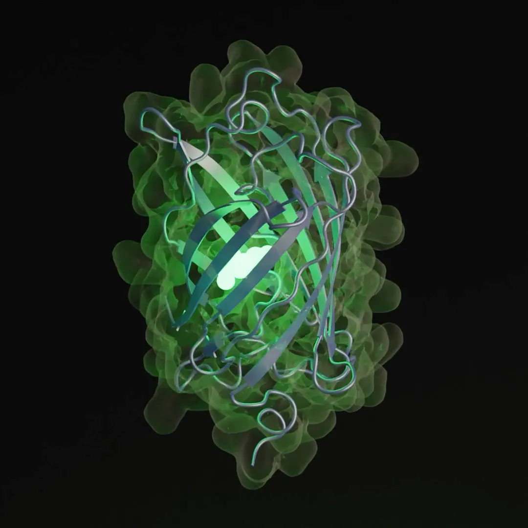 由ESM3产生的一种新的绿色荧光蛋白,与自然界中发现的其他荧光蛋白不同(来源:EvolutionaryScale)