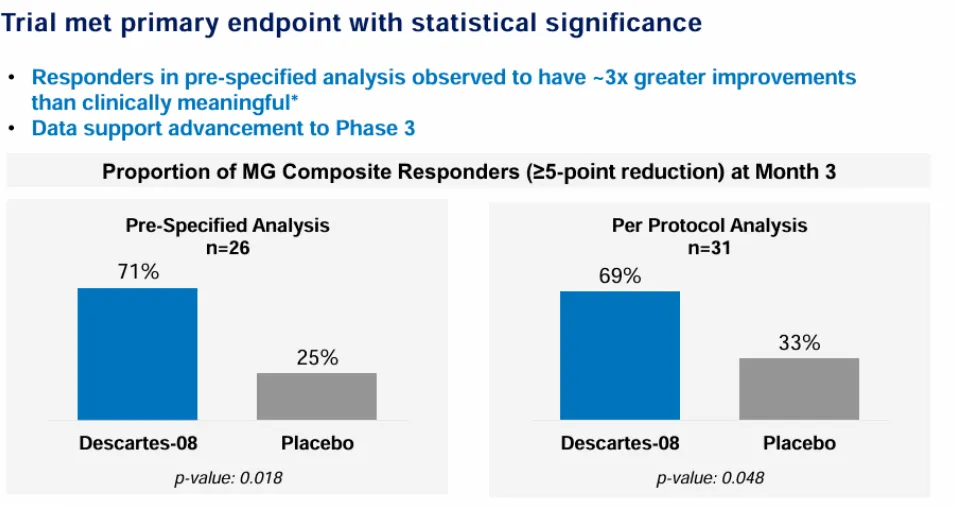 诚然,这条道路绝非坦途,相反,困难重重。2024年7月,Cartesian Therapeutics公布了旗下的靶向BCMA的mRNA CAR-T疗法Descartes-08 ,在全身性重症肌无力(gMG)中取得了所谓2b期积极结果,但股价随即大跌35%。究其原因,数据并未其宣称的那么靓眼。该研究共纳入36例患者,但在分析主要临床终点时,删除了在社区诊所接受治疗的九名患者,仅限制在26名在学术医疗中心入组的人。排除一例退出的患者,试验组和对照组的MGC(MG复合量表)比例分别为71%和25%(p=0.018),但若不做删失处理,31例受试者的MGC比例分别为69%和33%(p=0.048)。简而言之,若不做删失处理,试验组和对照组并未存在显著差异,这也是投资者选择用脚投票的关键。