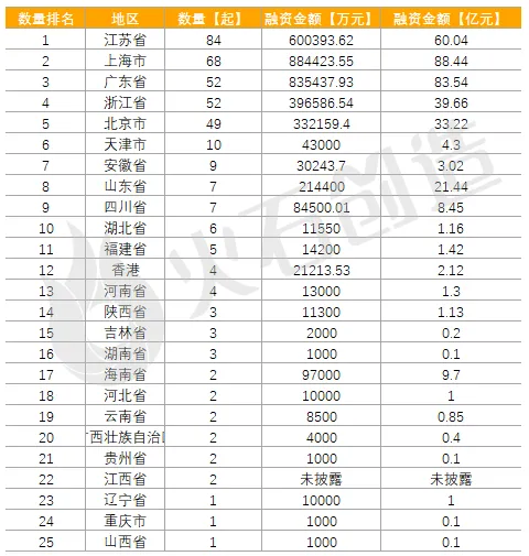 从融资地域看,今年上半年融资事件主要分布在江苏省(84起)和上海市(68起)。从融资金额来看,上海市最为突出,融资金额高达88.44亿元;其次,广东省也较为突出,融资金额达83.54亿元。