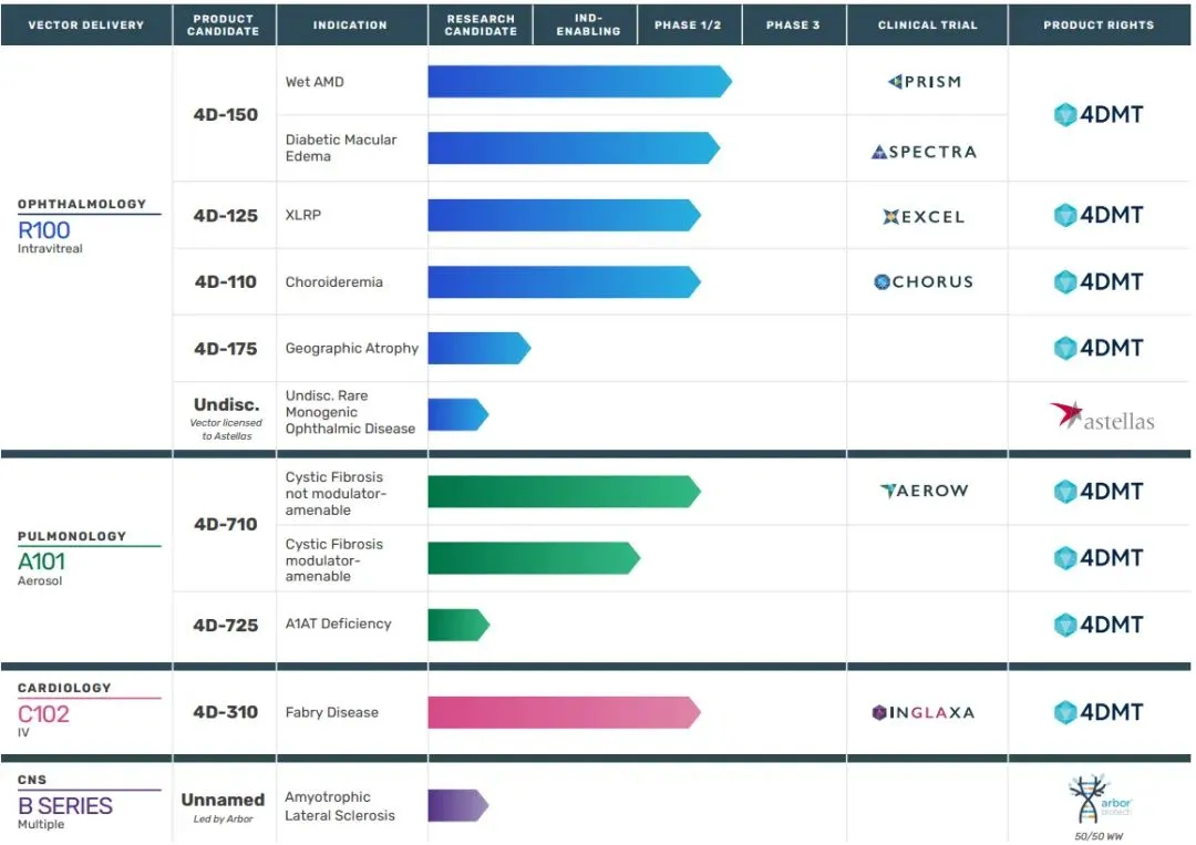 目前,4DMT正在推进5种临床阶段和2种临床前候选产品,用于治疗眼科(玻璃体内给药)、肺部(气溶胶递送)和心脏(静脉注射)等疾病,4D-150是进展最快的候选药物。