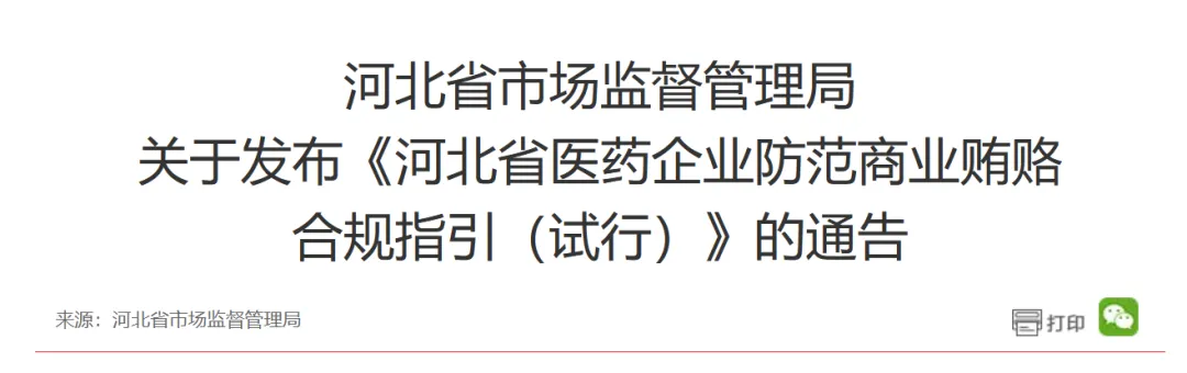 近日,河北省市场监督管理局发布《河北省医药企业防范商业贿赂合规指引(试行)》的通告(以下简称“通告”),对药企的商业贿赂行为、如何防范等作出具体规定。