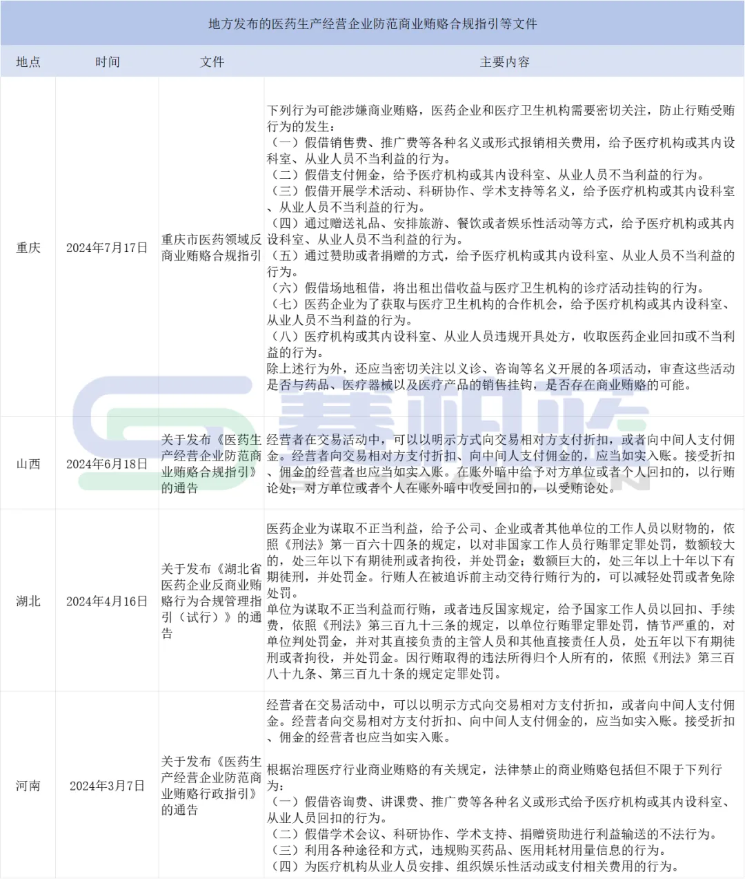 截至目前,山西、青海、福建等多地公开举报电话,聚焦医药企业多种形式商业贿赂,搜集违法行为线索。广东、湖南等地还发布告诫函,严禁商业贿赂行为。