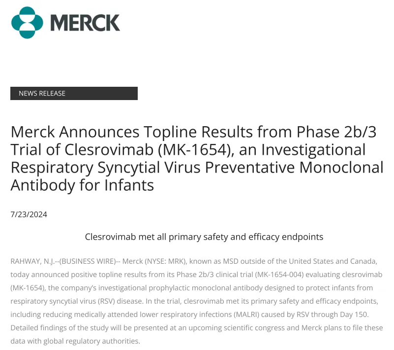 7月23日,默沙东宣布Clesrovimab(MK-1654)预防呼吸道合胞病毒(RSV)感染的IIb/III期MK-1654-004研究取得了积极结果。