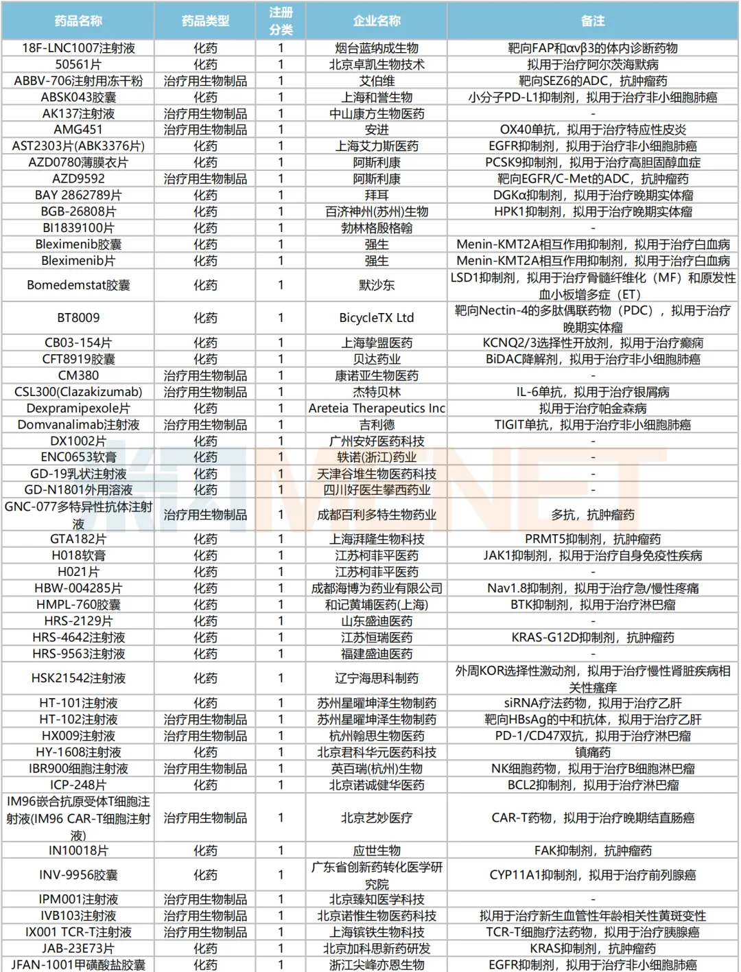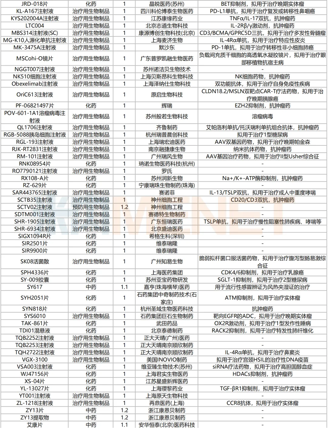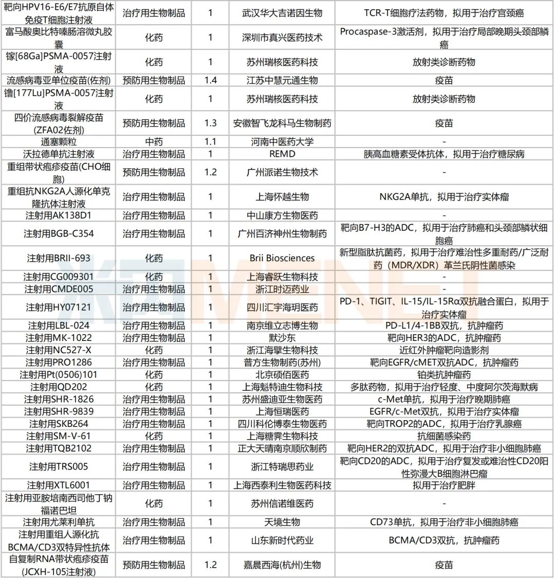 数据来源:米内网中国申报进度数据库(MED)、CDE、NMPA;相关统计字段按药品名称统计,申报企业数按主申报企业统计,时间截至2024年7月31日;获批品种按NMPA发布时间统计;药物作用靶点以及适应症整理自公开资料。