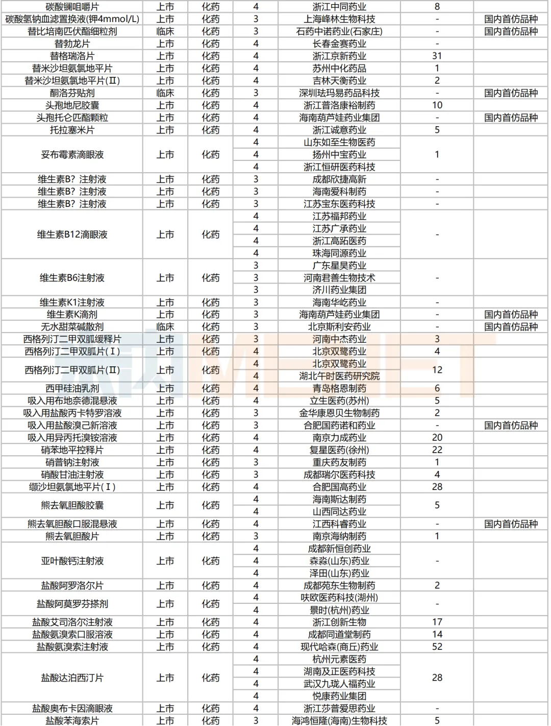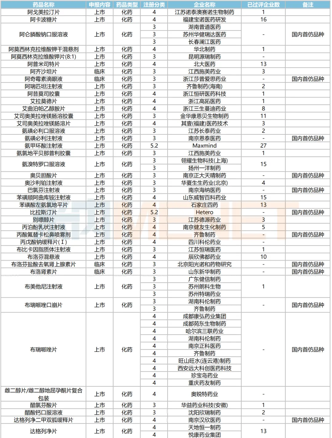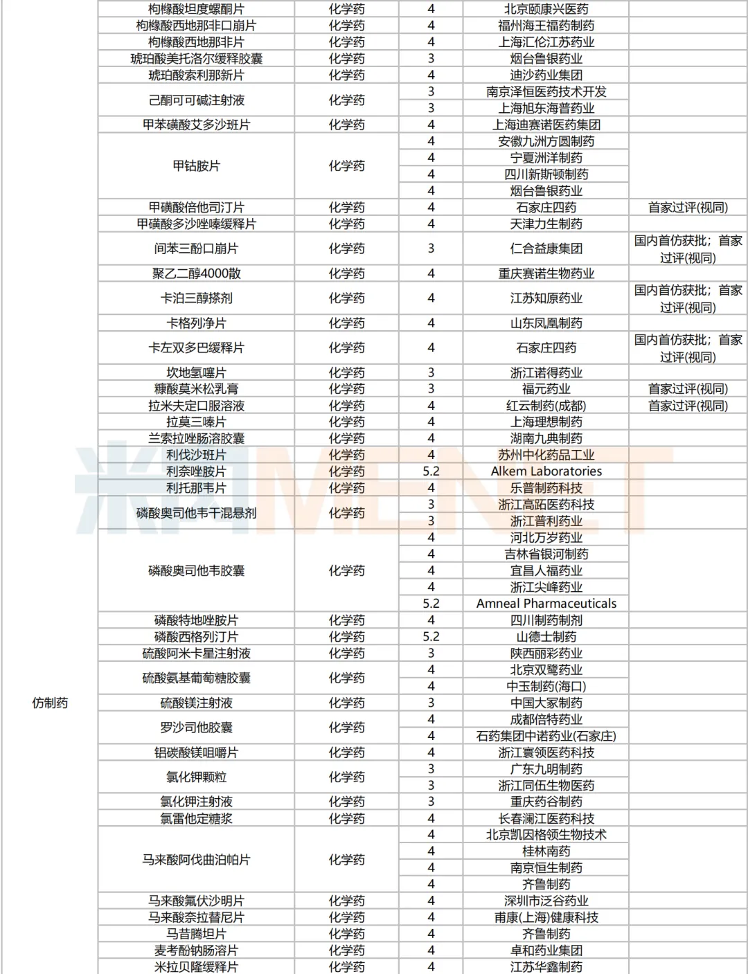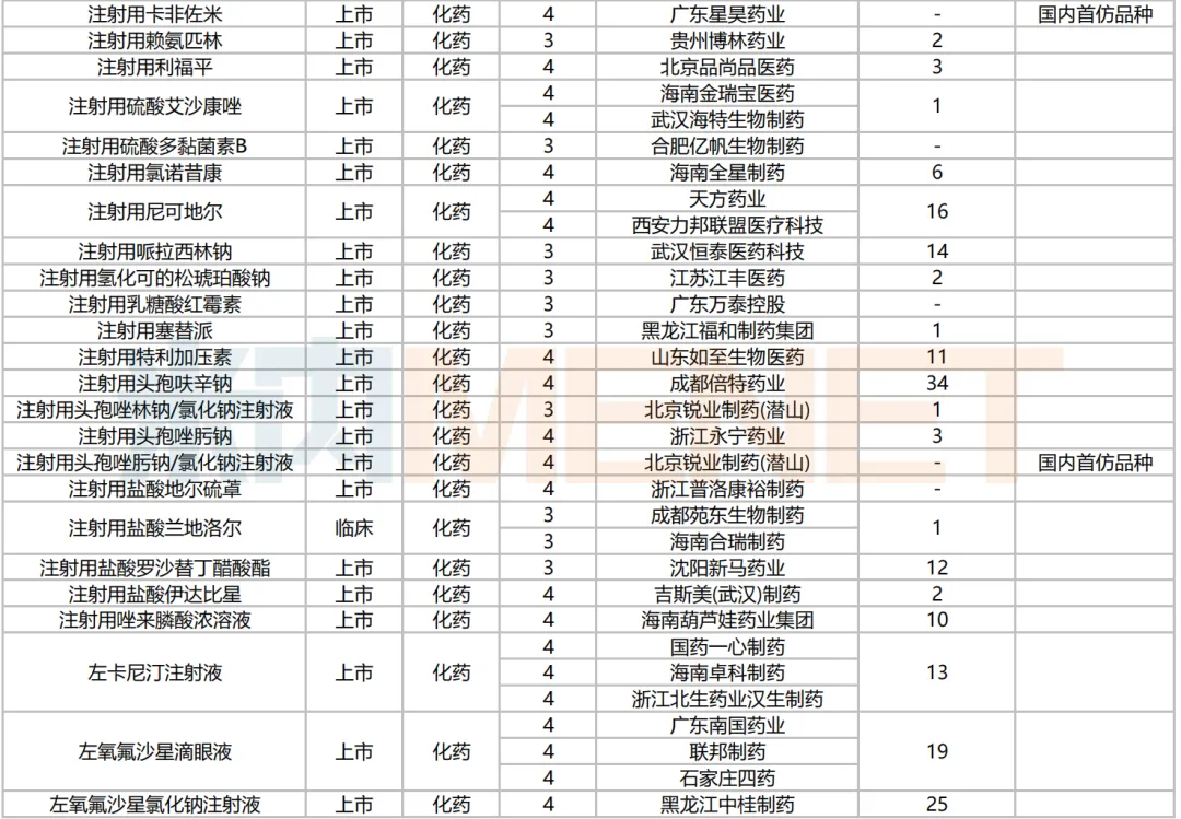 205个品种按新分类仿制申请获批并视同过评,53个品种按存量品种一致性评价补充申请过评。35个品种首家过评,其中,恩曲利匹丙诺片(齐鲁制药)、间苯三酚口崩片(仁合益康集团)、卡泊三醇搽剂(江苏知原药业)、卡左双多巴缓释片(石家庄四药)、普瑞巴林口崩片(广州帝奇医药技术)、羟考酮纳洛酮缓释片(山东绿叶制药)、替米沙坦氨氯地平片(江西施美药业)、替普瑞酮胶囊(浙江核力欣健药业)等19个品种为国内首仿。