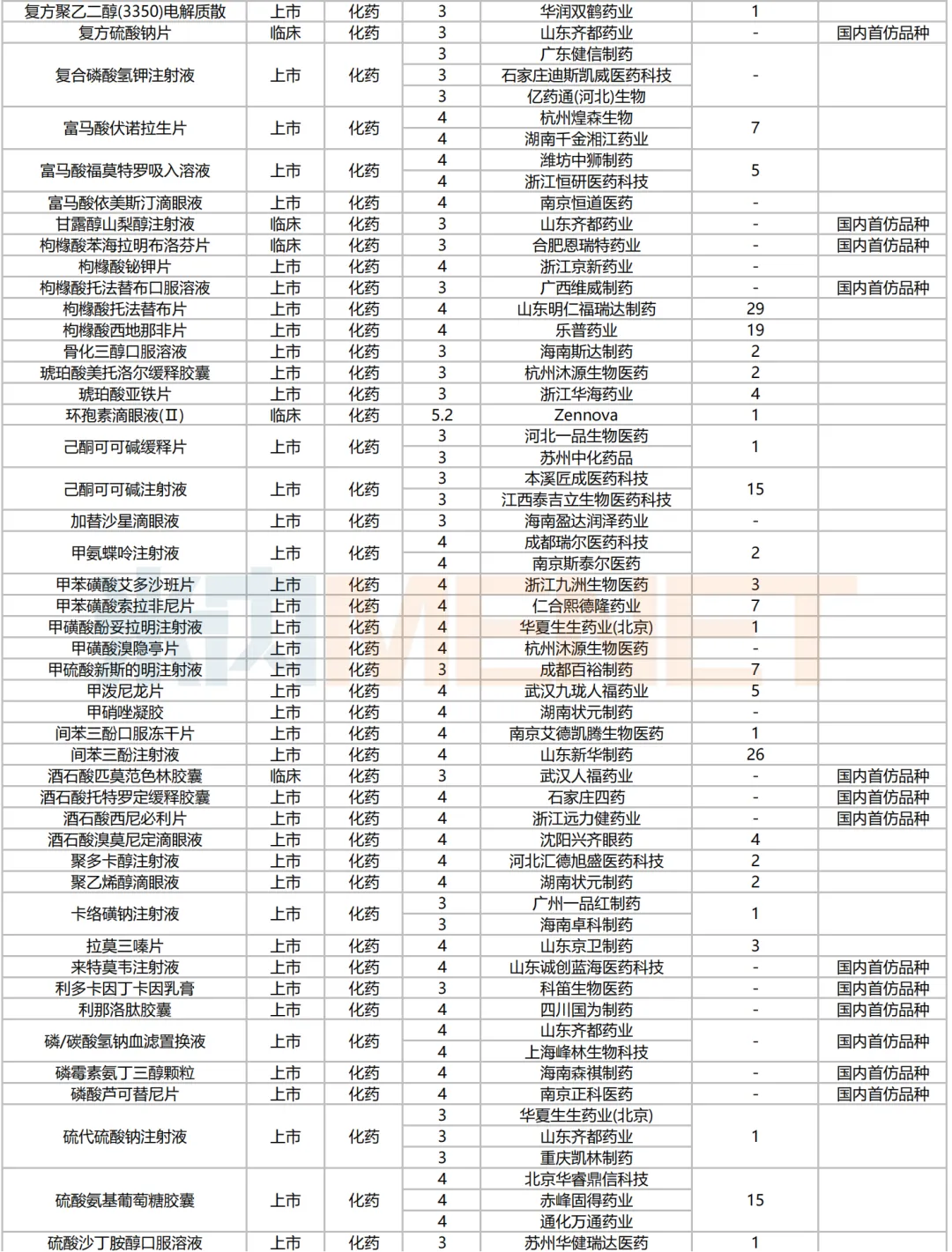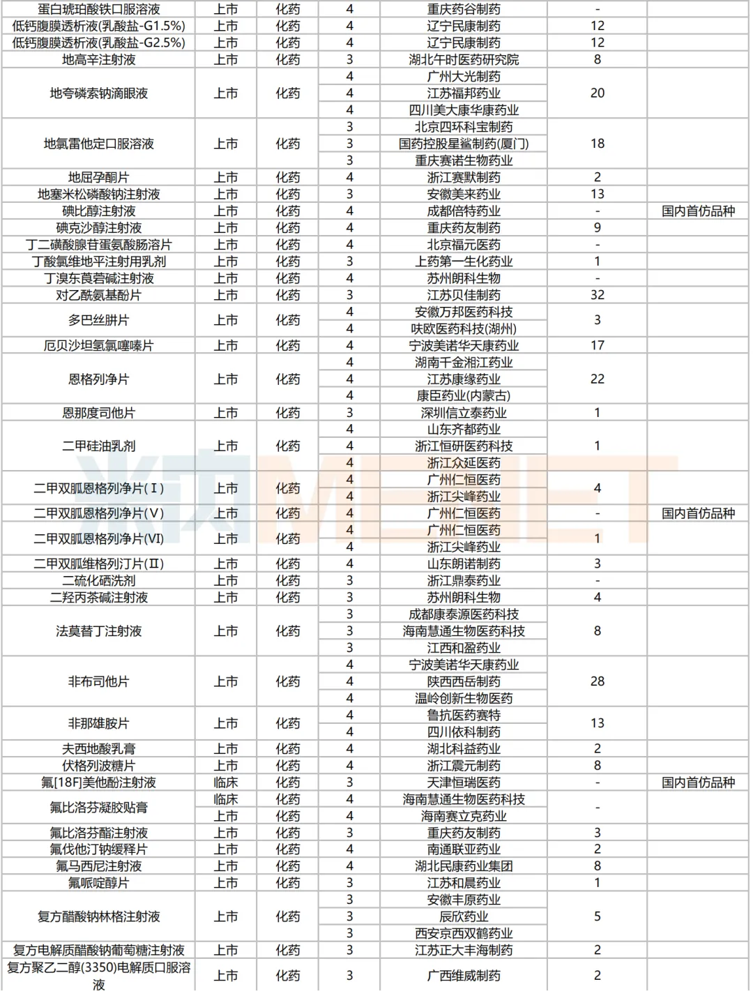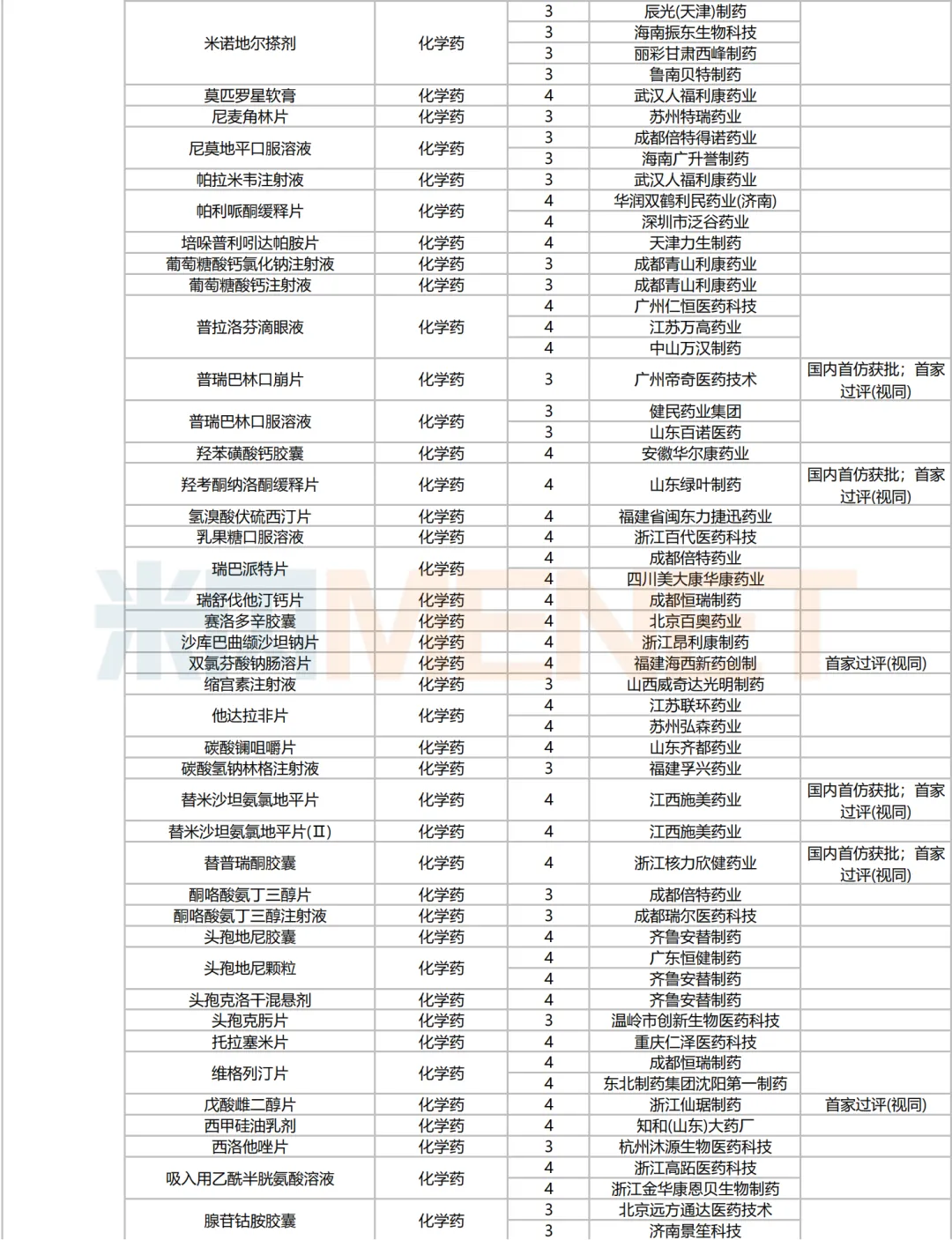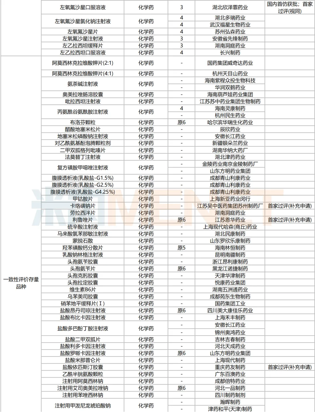 205个品种按新分类仿制申请获批并视同过评,53个品种按存量品种一致性评价补充申请过评。35个品种首家过评,其中,恩曲利匹丙诺片(齐鲁制药)、间苯三酚口崩片(仁合益康集团)、卡泊三醇搽剂(江苏知原药业)、卡左双多巴缓释片(石家庄四药)、普瑞巴林口崩片(广州帝奇医药技术)、羟考酮纳洛酮缓释片(山东绿叶制药)、替米沙坦氨氯地平片(江西施美药业)、替普瑞酮胶囊(浙江核力欣健药业)等19个品种为国内首仿。