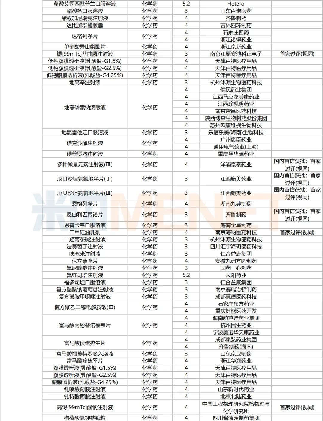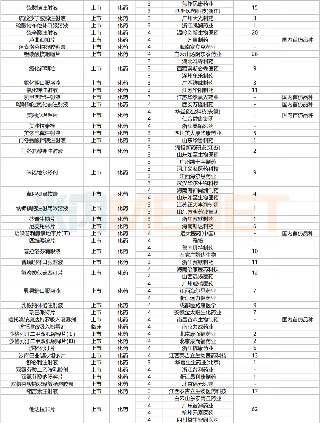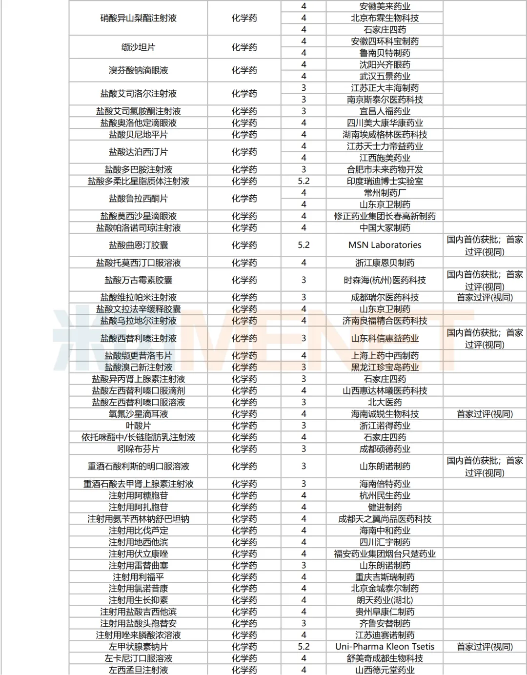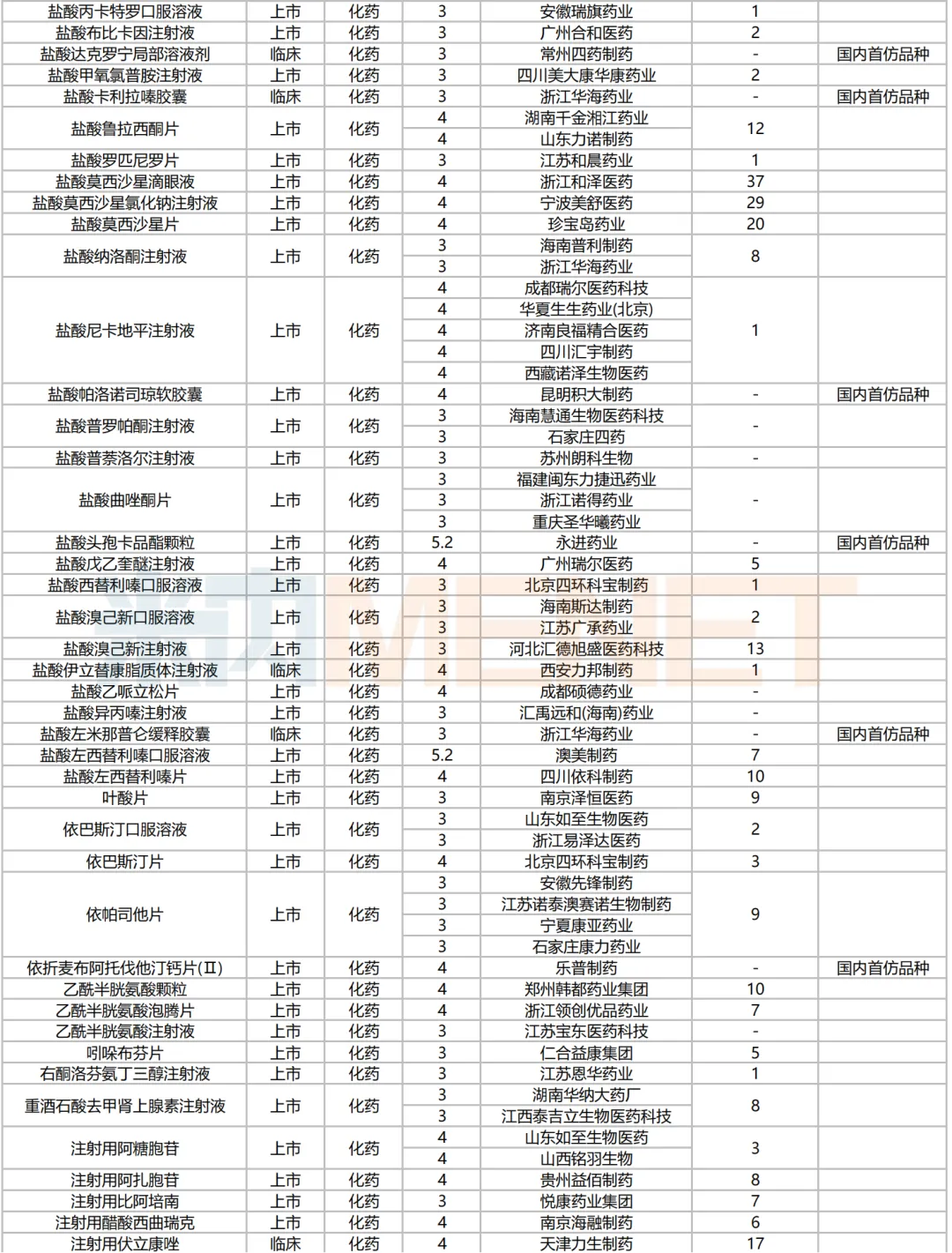 205个品种按新分类仿制申请获批并视同过评,53个品种按存量品种一致性评价补充申请过评。35个品种首家过评,其中,恩曲利匹丙诺片(齐鲁制药)、间苯三酚口崩片(仁合益康集团)、卡泊三醇搽剂(江苏知原药业)、卡左双多巴缓释片(石家庄四药)、普瑞巴林口崩片(广州帝奇医药技术)、羟考酮纳洛酮缓释片(山东绿叶制药)、替米沙坦氨氯地平片(江西施美药业)、替普瑞酮胶囊(浙江核力欣健药业)等19个品种为国内首仿。