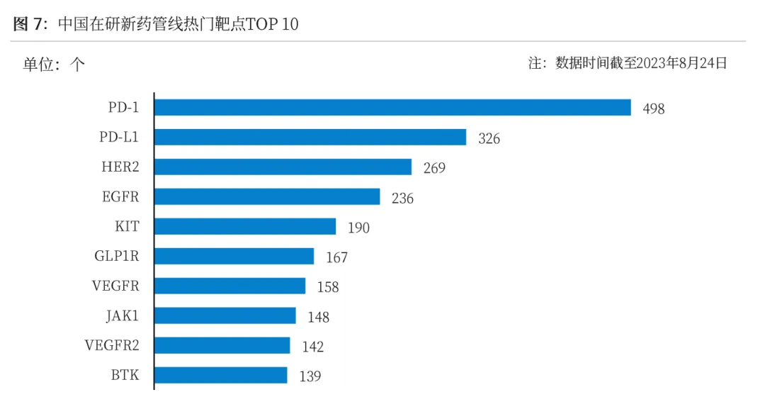 在国家政策大力支持下,我国创新药研发管线数量持续上升,但随之而来的内卷现象也越发严重,存在 多家企业齐聚同一热门靶点进行研发的现象。CDE数据显示,我国目前创新药研发集中在PD-1、PD-L1、HER2、EGFR等靶点,其中PD-1在研管线约500个,远超其他靶点。近年来,一些靶点如CD 19也获得 持续高关注,该靶点在2022年获59.8亿人民币融资,稳居TOP1。