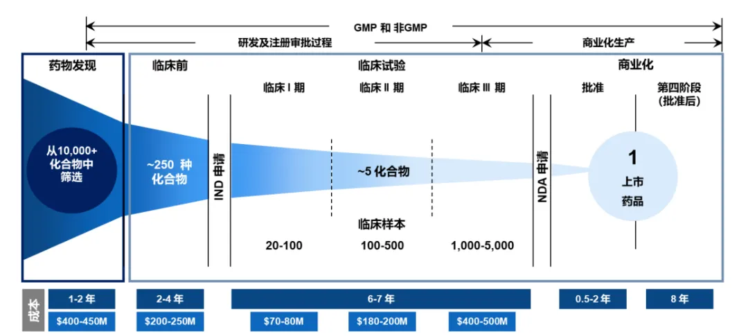 这些临床试验不仅需要巨额的资金支持,还需要跨学科的专业知识和严格的项目管理。根据Frost&Sullivan指出新药研发包括从药物发现至获后的研究这一过程、成本高、复杂、风险大、耗时长,至少需要10年时间,投资超过10亿美元。此外,临床试验的失败率也相当高,这意味着即使投入了大量资源,也有可能最终无法成功上市。