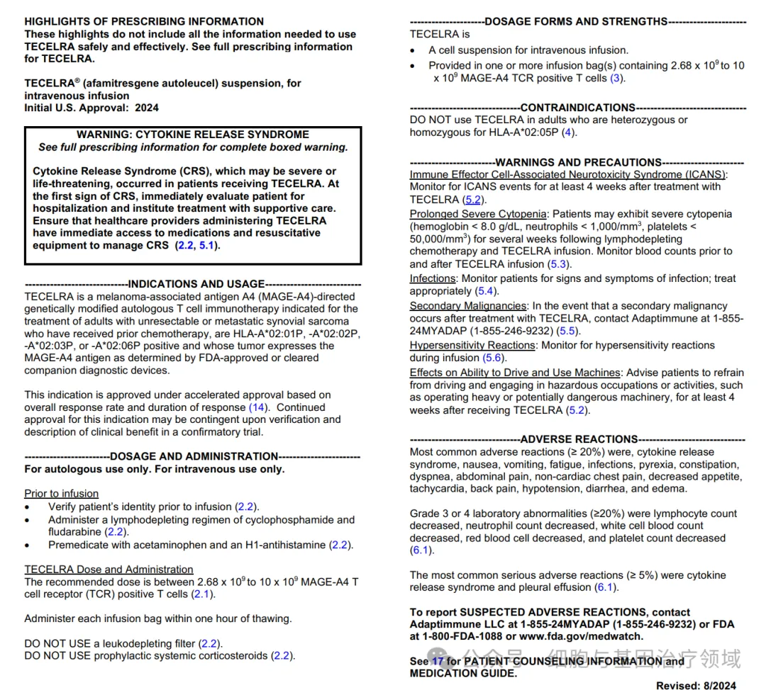 TECELRA的常见不良反应包括细胞因子释放综合征(CRS)、恶心、呕吐、疲劳等。此外,该疗法还可能会引发细胞减少症、感染、二次恶性肿瘤及过敏反应等严重副作用。TECELRA不适用于HLA-A*02:05P纯合子或杂合子成人患者。