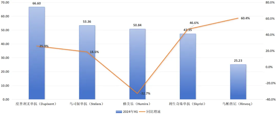 在“老药王”修美乐(Humira)营收同比下滑32.7%的情况下,度普利尤单抗(Dupixent)凭借25.9%的营收增长,在2024上半年实现营收66.6亿美元,超越一众自免药物成为新的“自免之王”。