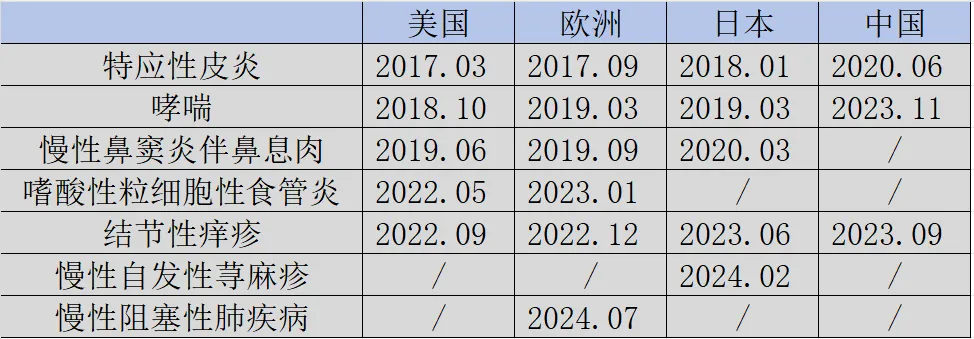 自2017年3月获批AD后,度普利尤单抗并没有停下脚步,而是持续拓展至更多新的适应症。此后几年时间中,度普利尤单抗分别获批了哮喘、慢性鼻窦炎伴鼻息肉、嗜酸性粒细胞性食管炎、结节性痒疹、慢性自发性荨麻疹、慢性阻塞性肺疾病(COPD)。
