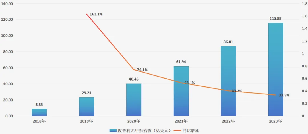 图:度普利尤单抗营收及增速,来源:锦缎研究院