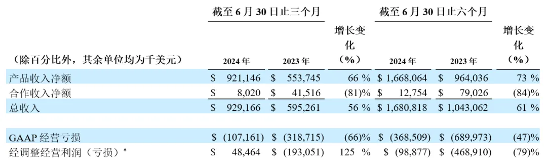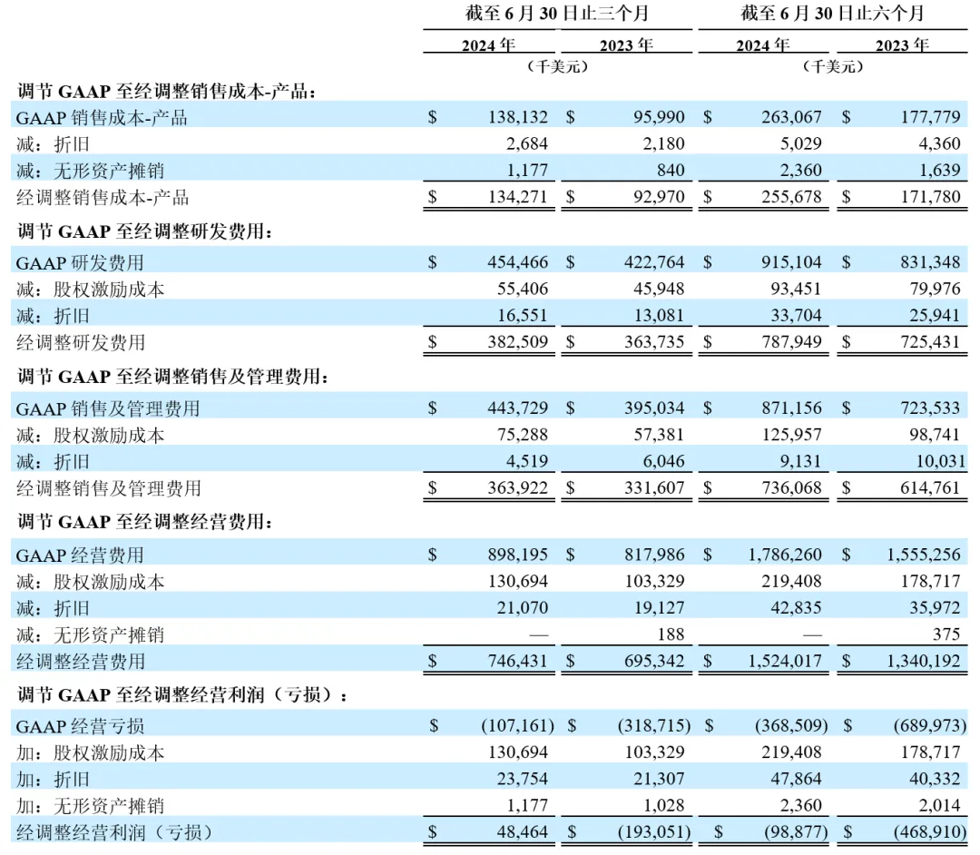 GAAP净亏损:在截至2024年6月30日止的季度中,GAAP净亏损与去年同期相比有所改善,主要因为产品收入增长和费用管理举措提升了经营杠杆效益。
