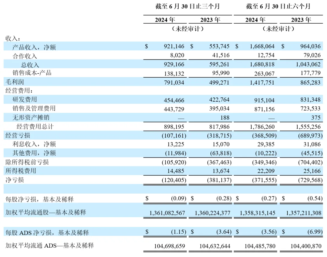 在截至2024年6月30日止的季度中,每股普通股净亏损为0.09美元,每股美国存托股份(ADS)净亏损为1.15美元;去年同期每股普通股净亏损为0.28美元,每股ADS净亏损为3.64美元。