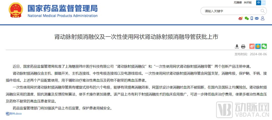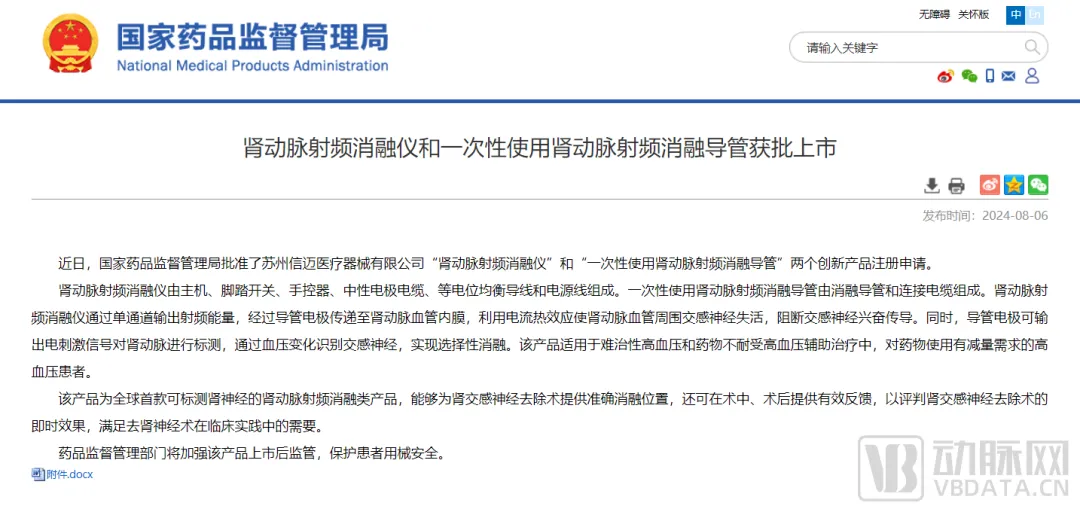 8月6日,国家药品监督管理局(NMPA)官网发布消息,批准了苏州信迈医疗器械有限公司(后文简称“信迈医疗”)与上海魅丽纬叶医疗科技有限公司(后文简称“魅丽纬叶”)旗下创新产品肾动脉射频消融仪的注册申请。而在稍早前的4月,美敦力旗下的肾动脉射频消融仪获NMPA批准(国内首款上市的同类产品),今年国内已共计有3款肾动脉射频消融仪申请成功。