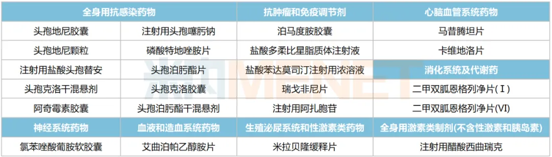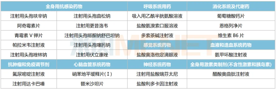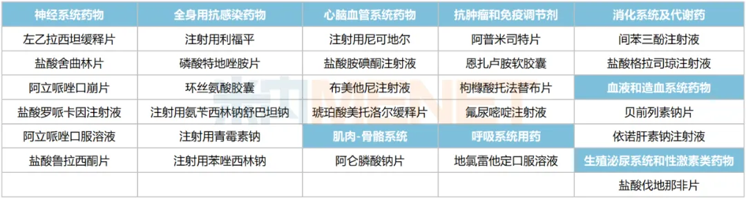 131个品种涵盖13个治疗大类,集中在消化系统及代谢药(24个)、全身用抗感染药物(18个)、血液和造血系统药物(16个)、神经系统药物(16个)、心脑血管系统药物(13个)等。