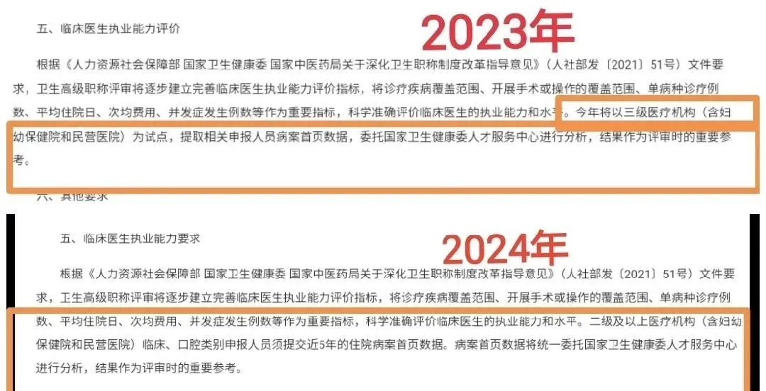 文件第五项对于“临床医生执业能力要求”明确规定:卫生高级职称评审将逐步建立完善临床医生执业能力评价指标,将诊疗疾病覆盖范围、开展手术或操作的覆盖范围、单病种诊疗例数、平均住院日、次均费用、并发症发生例数等作为重要指标,科学准确评价临床医生的执业能力和水平。二级及以上医疗机构(含妇幼保健院和民营医院)临床、口腔类别申报人员须提交近5年的住院病案首页数据。病案首页数据将统一委托国家卫生健康委人才服务中心进行分析,结果作为评审时的重要参考。