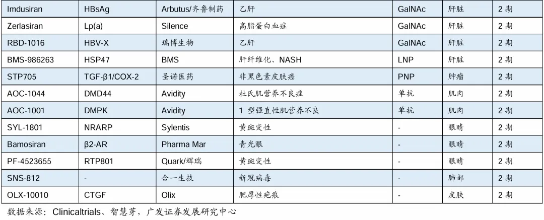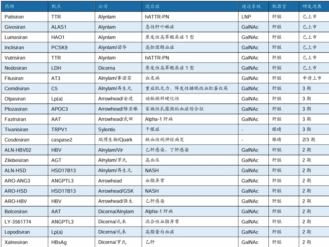 全球siRNA药物在研管线(研发进展处于临床II期阶段以上)